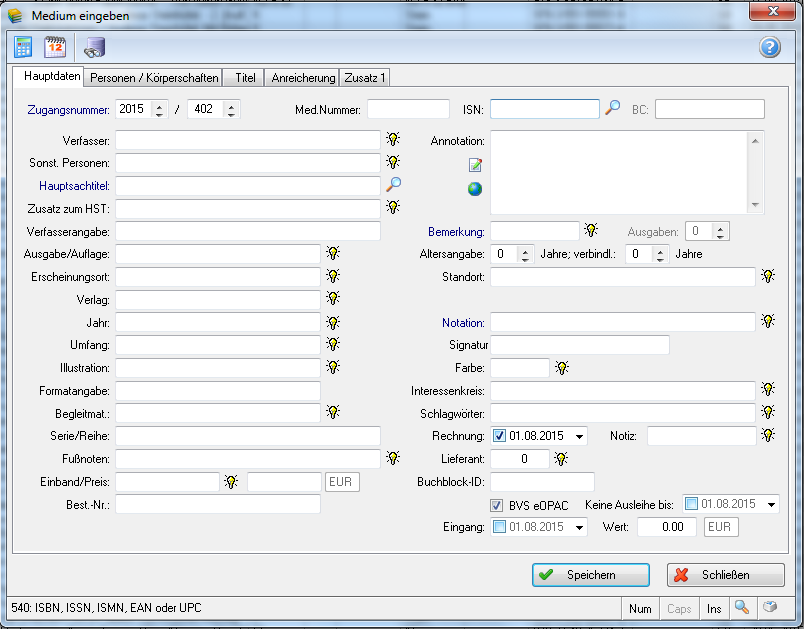 BVS hilft Ihnen beim Erfassen eines Mediums an so vielen Stellen wie möglich: Die Erfassungsmaske ist klar gegliedert und fasst die wichtigsten Felder zum Katalogisieren sinnvoll zusammen. Hinter vielen Feldern verbergen sich ausführliche Listen und Register, auf die Sie bei der Katalogisierung zurückgreifen können: So ist mit einem Klick auf das Glühbirnen-Symbol im Handumdrehen die richtige Notation für ein Medium herausgesucht.