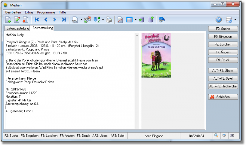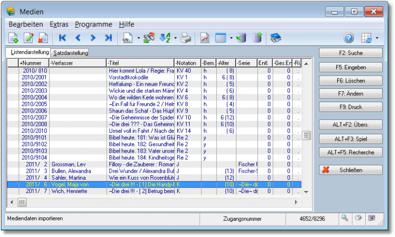Die Listendarstellung bietet dabei einen Überblick über den gesamten Bestand. Viele wichtige Daten der Medien sind direkt in den einzelnen Spalten zu sehen, sodass Sie Ihren Bestand nach Systematik, letztem Rückgabedatum oder Standorten sortieren und durchsuchen können. Über farbliche Kennzeichnungen wird für Sie ersichtlich, ob ein Medium regelmäßig entliehen wird, oder ob es ein Ladenhüter bleibt.