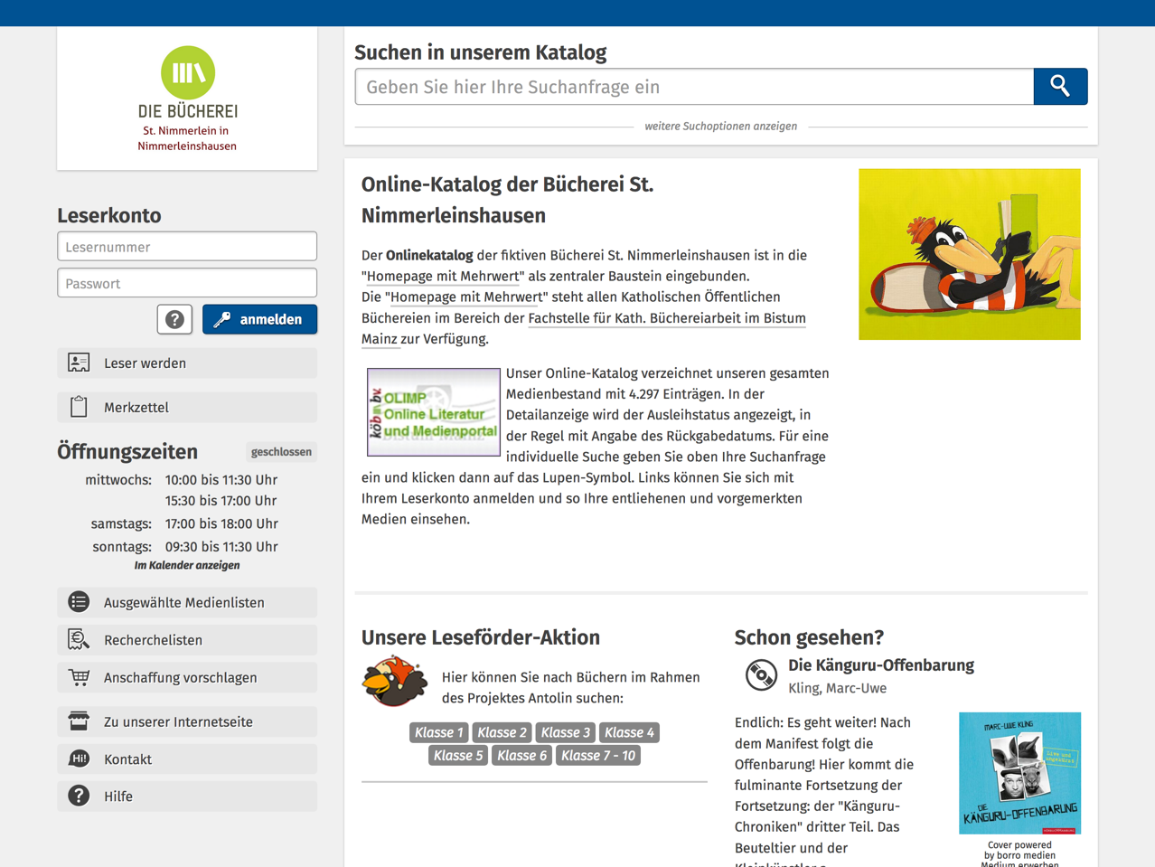 Der BVS eOPAC ist ein innovativer Online-Bibliothekskatalog zur Medienrecherche, Anzeige der Leserkonten, Neuerwerbungen, Top-Ausleihlisten und vielem mehr. Ihre Daten werden dabei per Knopfdruck übermittelt und tagesaktuell Ihren Lesern im Internet bereit gestellt.