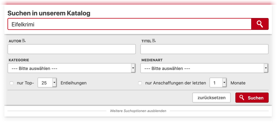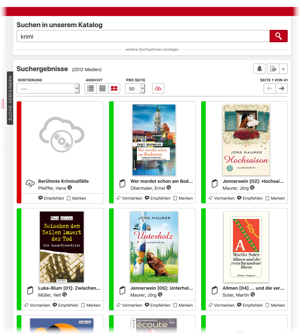 Die Ergebnisliste bleibt dabei klar und übersichtlich strukturiert. Ihre Besucher erfahren wichtige Informationen, wie Medientyp, Ausleihstatus und natürlich Autor und Titel auf einen Blick.