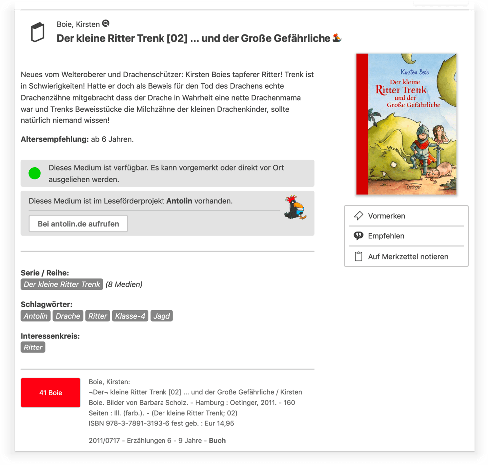 Aus der Ergebnisliste heraus kann der Besucher bereits auf wichtige Funktionen zurückgreifen und so sein Wunschmedium auf dem eigenen Merkzettel speichern, eine Vormerkung platzieren oder das Medium an Freunde oder Verwandte weiterempfehlen.